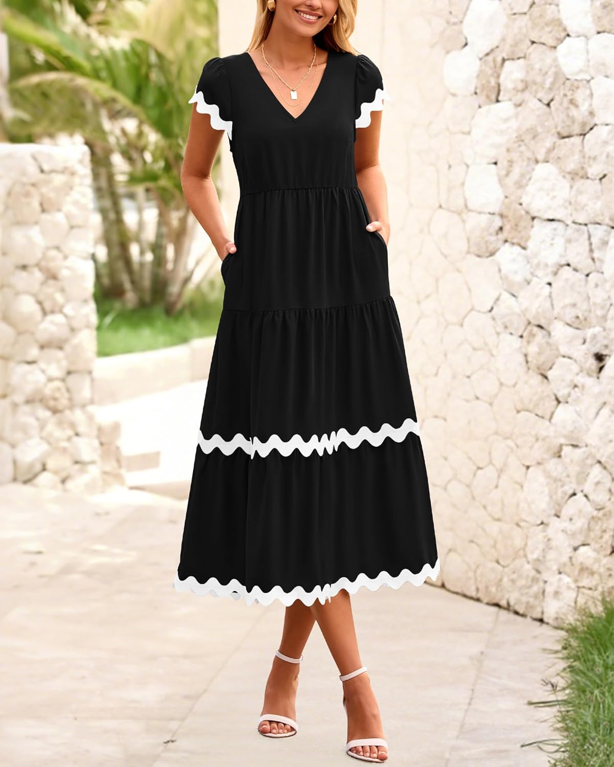 BTFBM Summer V Neck Cap Sleeve Tiered A Line Dress