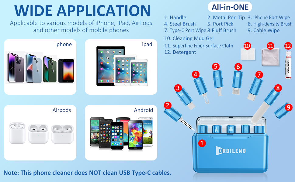 STURDY & COMPACT PORTABLE DESIGN – Our phone cleaner is made of high-quality sturdy ABS plastic, which can be closely attached cleaning to the charging port/cables of electronic devices. And this iphone cleaner kit is portable and lightweight so you can take it anywhere. The package includes 8 x tool cleaning brushes, 1 x Soft plastic lens cleaning pen 1 x Detergent, 1 x large microfiber cloth, 1 x user manual