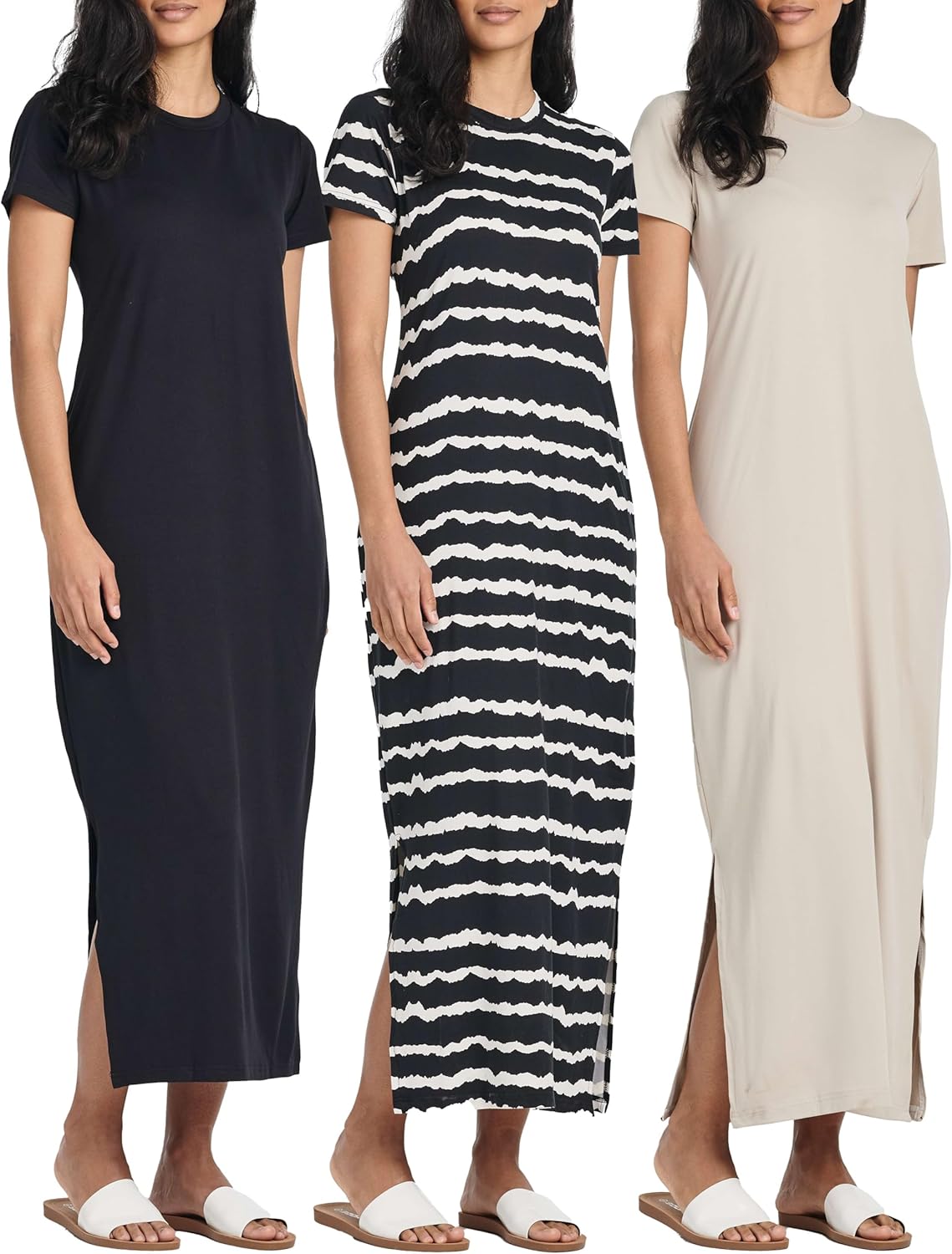 • Real Essentials 3 Pack Women’s Casual Short Sleeve Maxi T-Shirt Summer Dress with Slit & Pockets (Available in Plus Size)