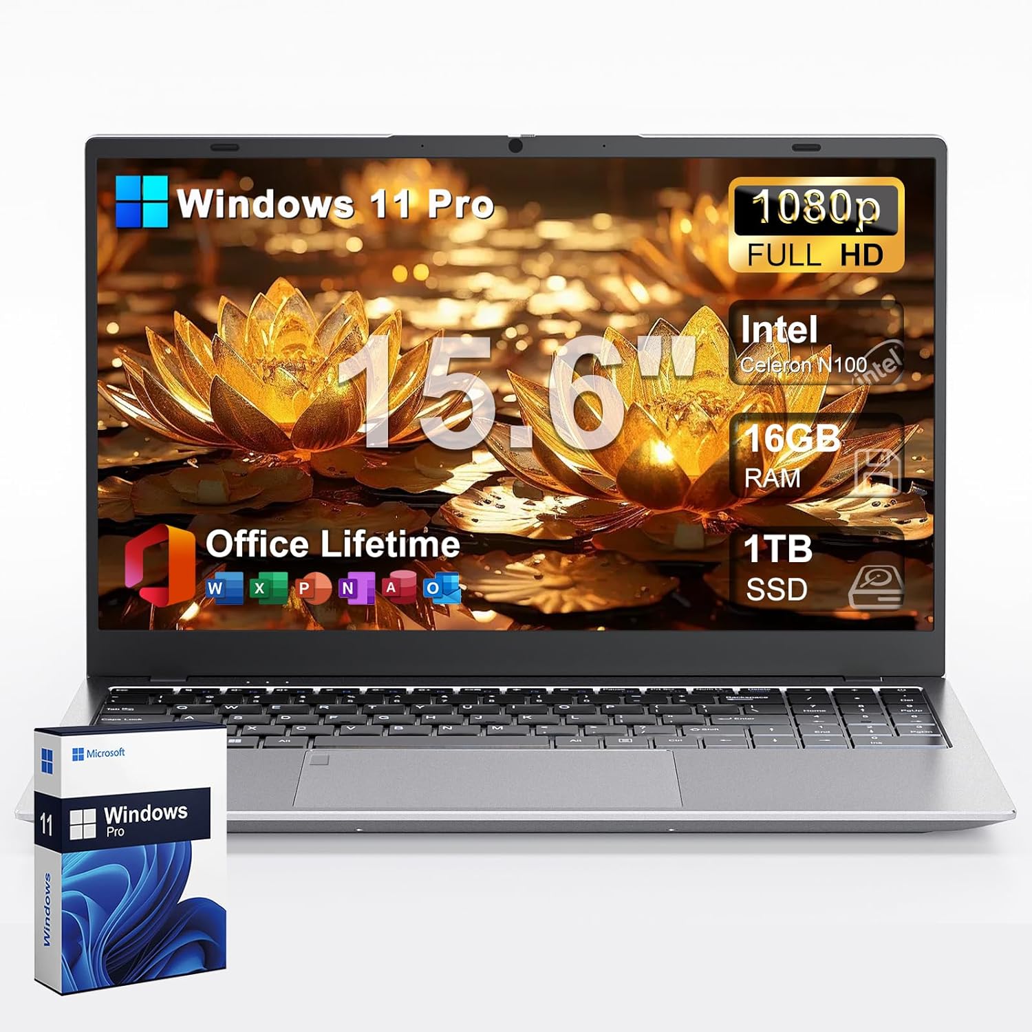 • 2025 Laptop Computer 15 15.6 inch FHD 1080p Display, Windows 11 Pro with MS Office for Students & Business, 16GB RAM, 1TB SSD, Intel 4-Core N100 (Up to 3.4GHz), Backlit Keyboard, Type-C, Fingerprint
